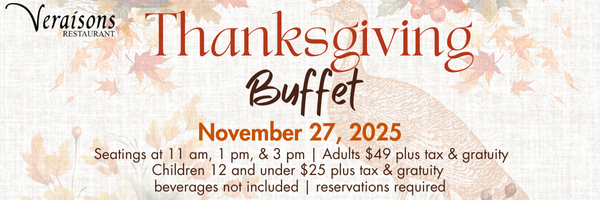 Join us at Veraisons for our Thanksgiving Day Buffet! With hot and cold selections, salads, vegan and vegetarian options, and gorgeous desserts, you'll enjoy all the flavors of the seasons with none of the cleanup.