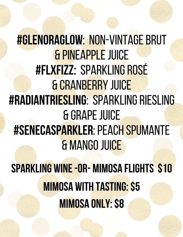 Each Sunday in our tasting room, join us for Sparkling Sundays! Every Sparkling Sunday, guests can enjoy mimosa flights for just $10! After your tasting, grab a full size mimosa of your choice for just $5. Want to just grab a glass and relax? No problem. $8 will get you the mimosa of your choice. See our menu below.